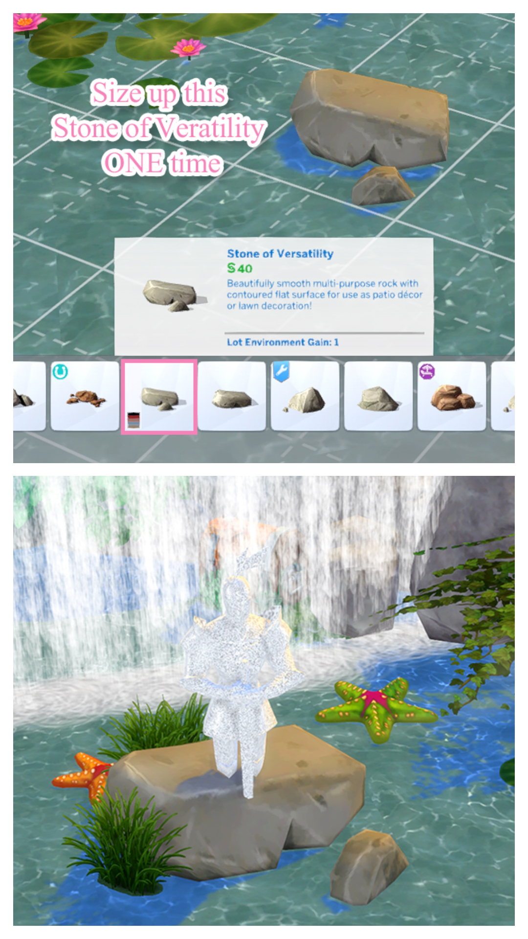 (click here to learn how to turn your Sim into a mermaid for posing) - For the stone, I used the in-game object called Stone of Versatility (size up this stone 1 time, look here)